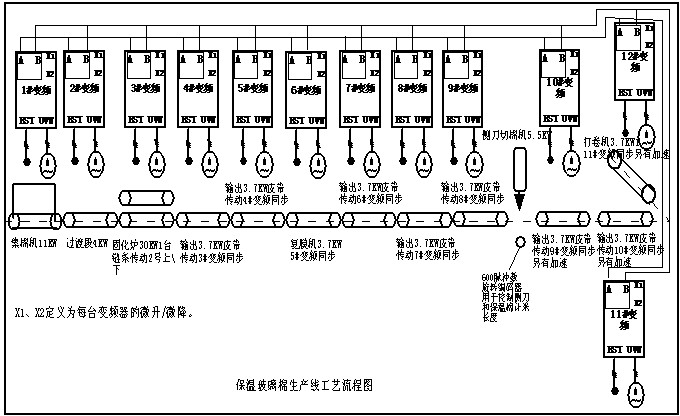 河北廊坊市是我国岩棉、玻璃棉生产的基地,其流水生产线采用传统的滑差调速电机+调速控制板+同步器方式来控制。目前我公司在廊坊市大成县神州集团成功的改造了3条流水生产线。一条9台流水生产线,两条12台流水生产线。该设备为全自动特大型摆锤法岩棉生产线. 板线有效固化长度25米,采用旋风喷水除尘脱硫工艺。改造完成后,客户反映在使用过程中运行稳定,同步效果好,精度高。节电率可达35%以上,次品率比未改造前大大降低,而且产量比以前有明显提高。