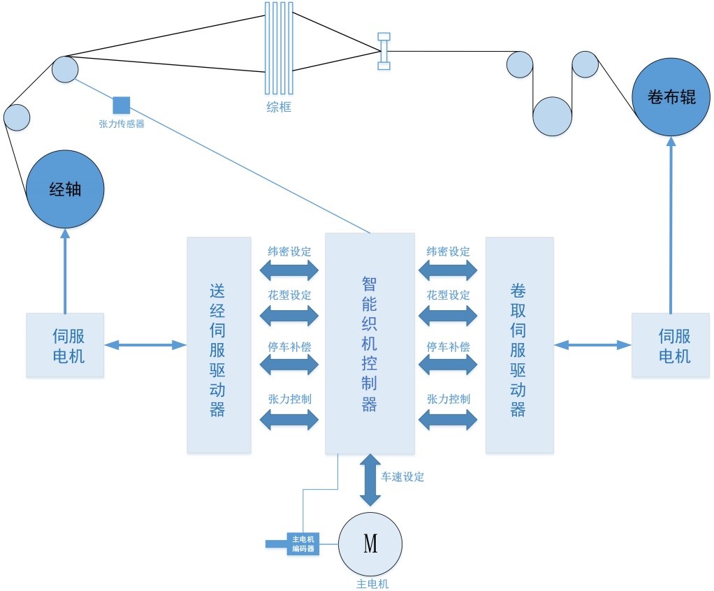 控制器作为主控单元,控制主电机的启停,可通过接触器或变频器进行超启动,使电机启动瞬间的力矩和速度达到要求。控制器连接触摸屏、伺服驱动器,同时接收多个传感器的信号。可在触摸屏上进行系统参数设定,包括车速设定,纬密设定,张力设定,花型设定等,同时向伺服驱动器发送脉冲以此控制送经卷取的速度。整个系统的关键在于控制器,主电机编码器反馈到控制器的信号,根据此信号,进行角度划分,以决定在每个固定的角度,控制器控制的每个部件(包括储纬器,夹纱器,转阀,探纬器等)进行动作。控制器也在旋转一周的角度中对张力传感器进行采样,取360个点的信号,取平均值,以此获得实际的张力值,从而控制伺服电机的转速。