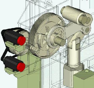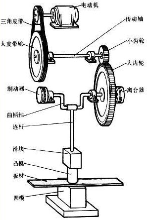 冲床是将圆周运动转换为直线运动,由主电机出力,带动飞轮,经离合器带动齿轮、曲轴(或偏心齿轮)、连杆等运转,来达到模具的直线运动。