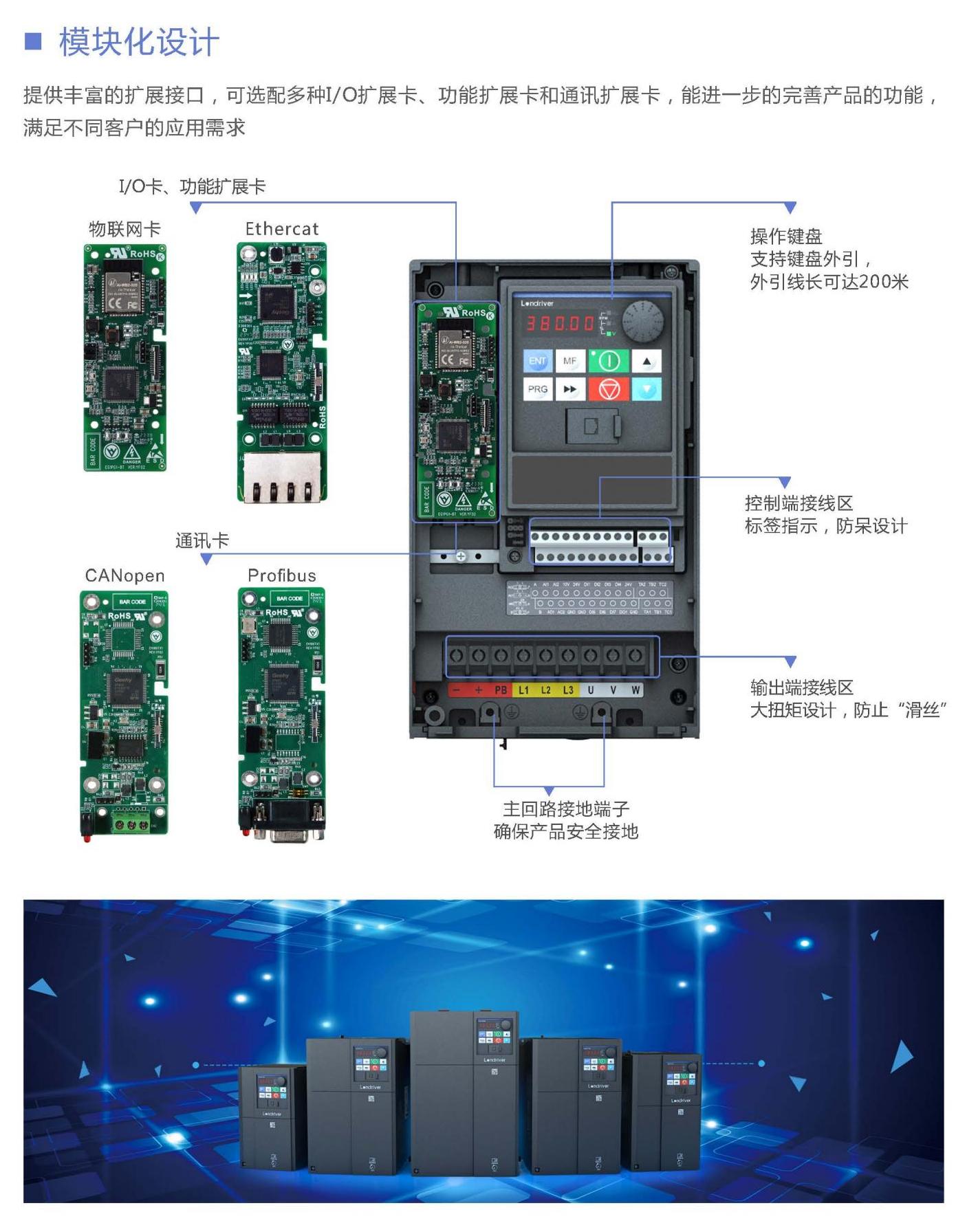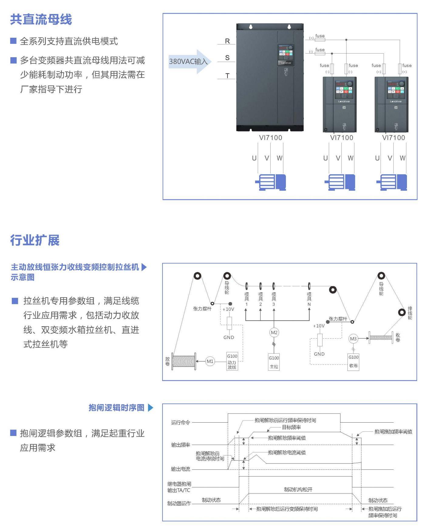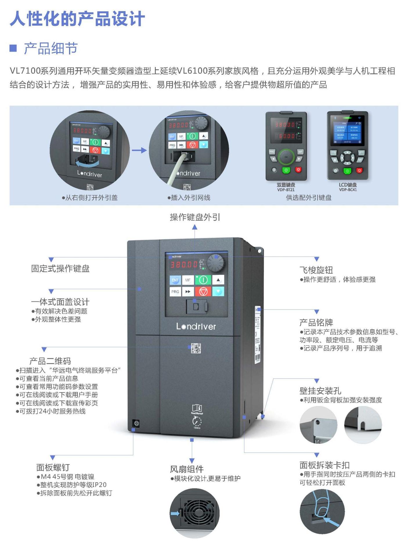 The VL7100 series universal open-loop vector frequency converter is a new generation universal product developed by Langqu Electric. The design adopts a straight golden ratio, with a rugged appearance and a strong sense of technology. The entire power range covers 4kW -800kW, supporting VF control and open-loop vector control. It is mainly aimed at supporting equipment such as centrifuges, extruders, industrial washing machines, and wire drawing machines in the domestic market, as well as the transformation needs of production lines in textile, injection molding, chemical fiber, cement, ceramics, and other industries, as well as large-scale project demands for fan and pump equipment in industries such as petrochemicals, oil refining, thermal power, water supply, and heating.