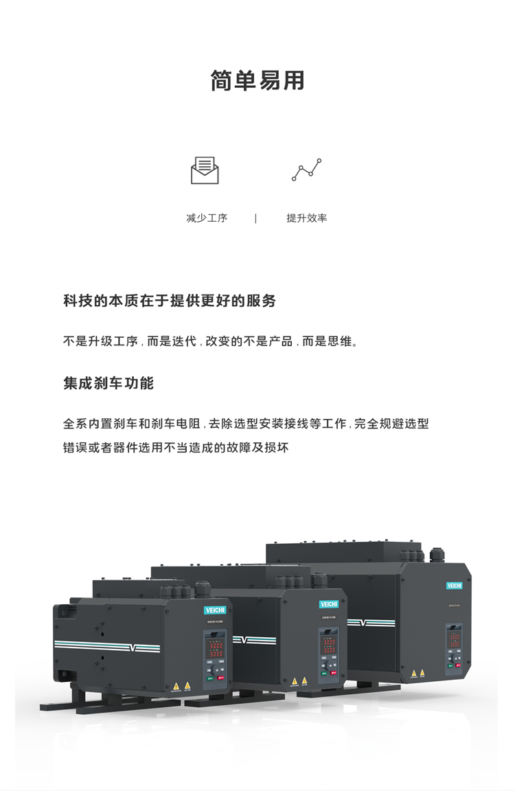 新壹代集成伺服產品,結合控制、動力、剎車於壹體,簡化安裝線路,減少橋架、線槽、接插件、線路節點,降低設備復雜性,提高空間利用率,安裝效率提升5倍以上。