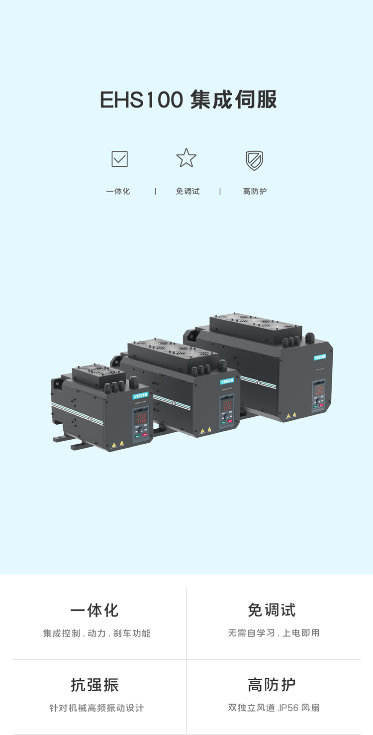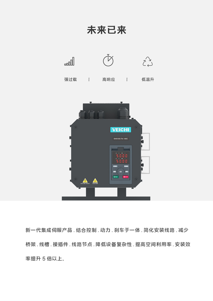 新一代集成伺服产品,结合控制、动力、刹车于一体,简化安装线路,减少桥架、线槽、接插件、线路节点,降低设备复杂性,提高空间利用率,安装效率提升5倍以上。